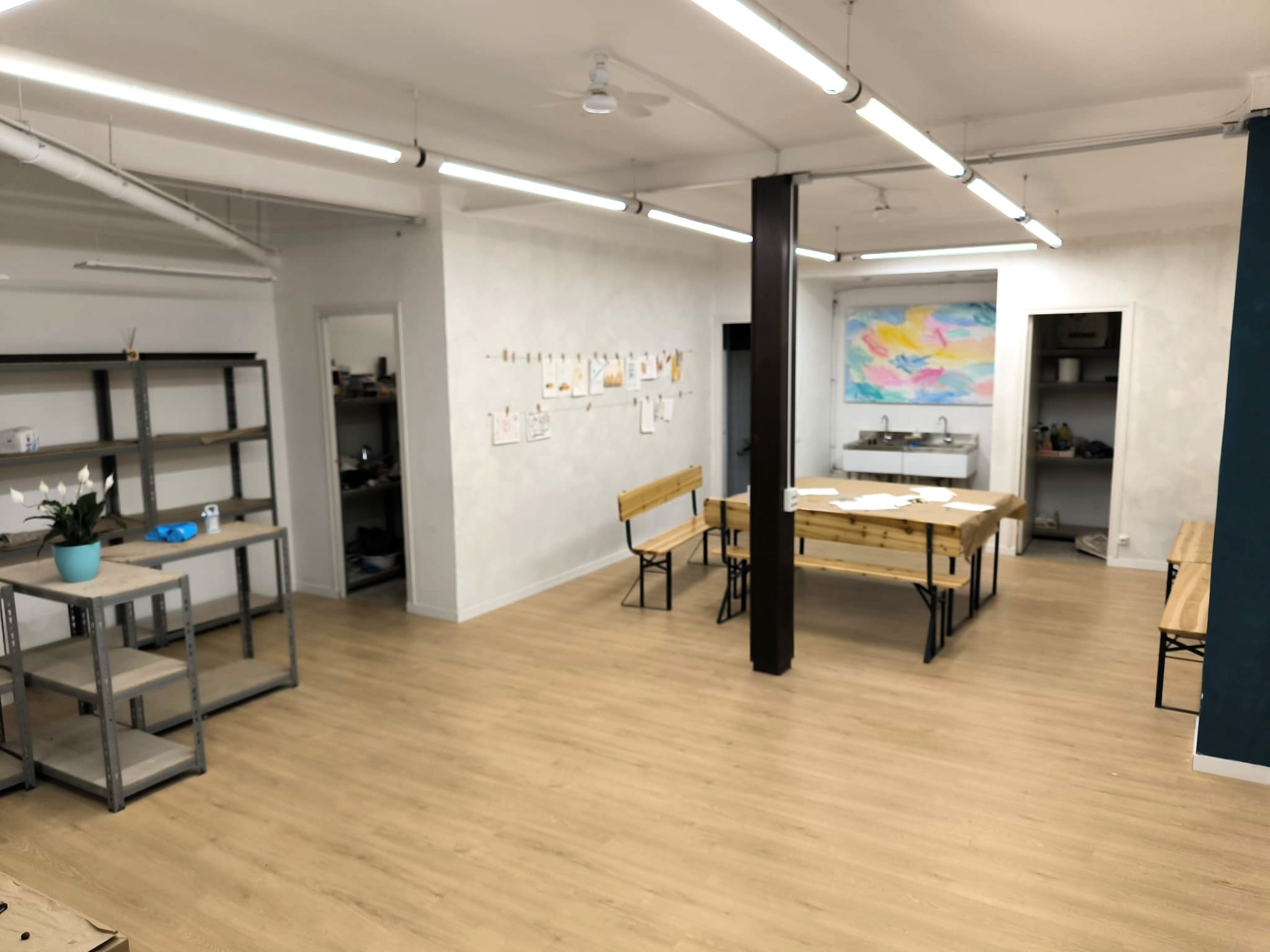 A la planta de baix comença l’aventura de fer amb les mans. El taller de producció és ple de taules grans, eines a l’abast, prestatges plens de materials de tot tipus: argiles, pigments, fustes, teles, cartrons, objectes reciclats… Aquí no hi ha materials “bons” o “dolents”, tots serveixen per provar, barrejar, equivocar-se i tornar a començar.