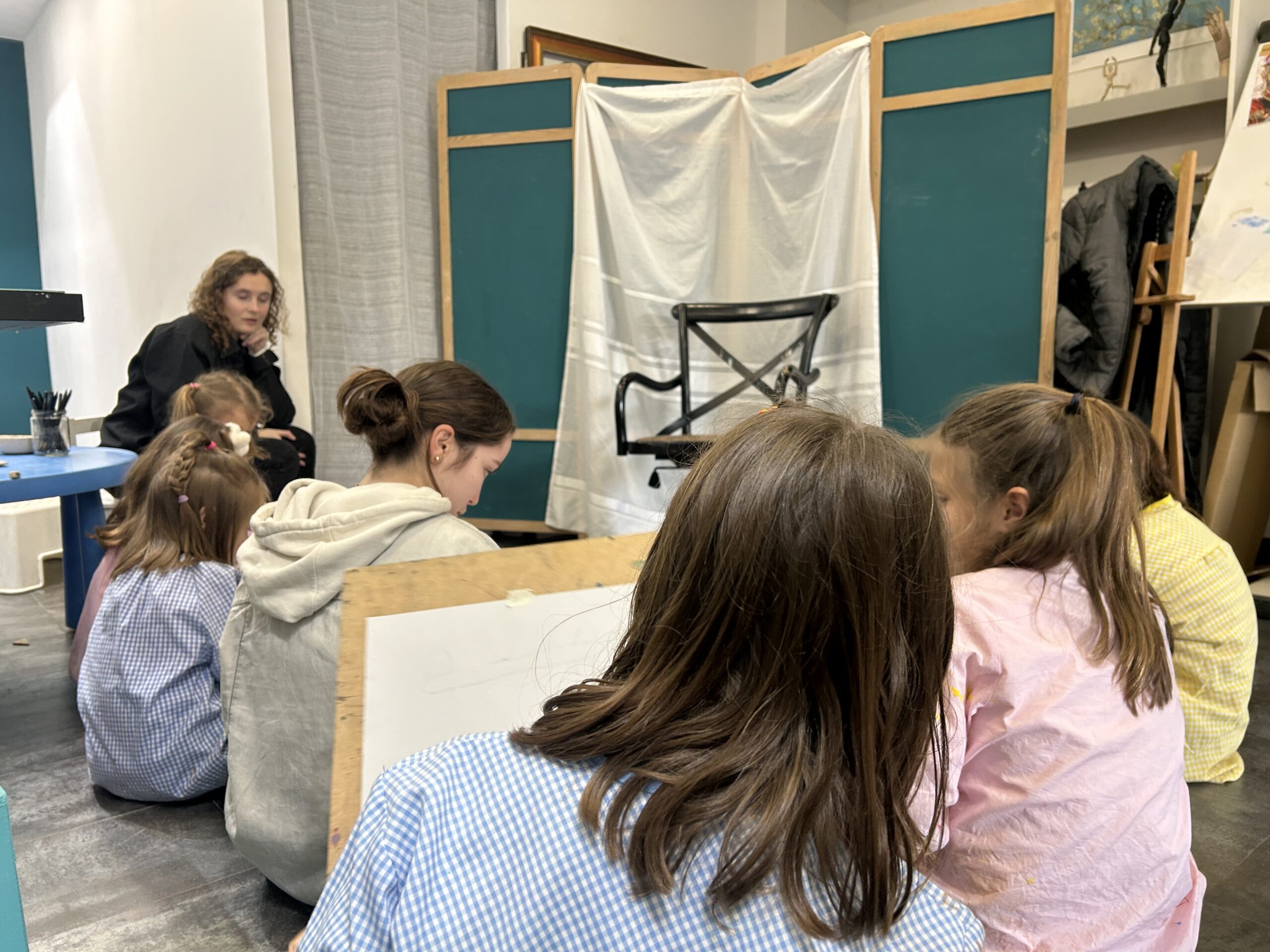 L’aula de dibuix es un espai més tranquil, amb parets clares i llum càlida. Aquí no hi ha pressa ni massa soroll: el protagonisme és per a les obres i els processos. Pots seure o treballar dret, pintar en silenci o parlant amb els altres.
